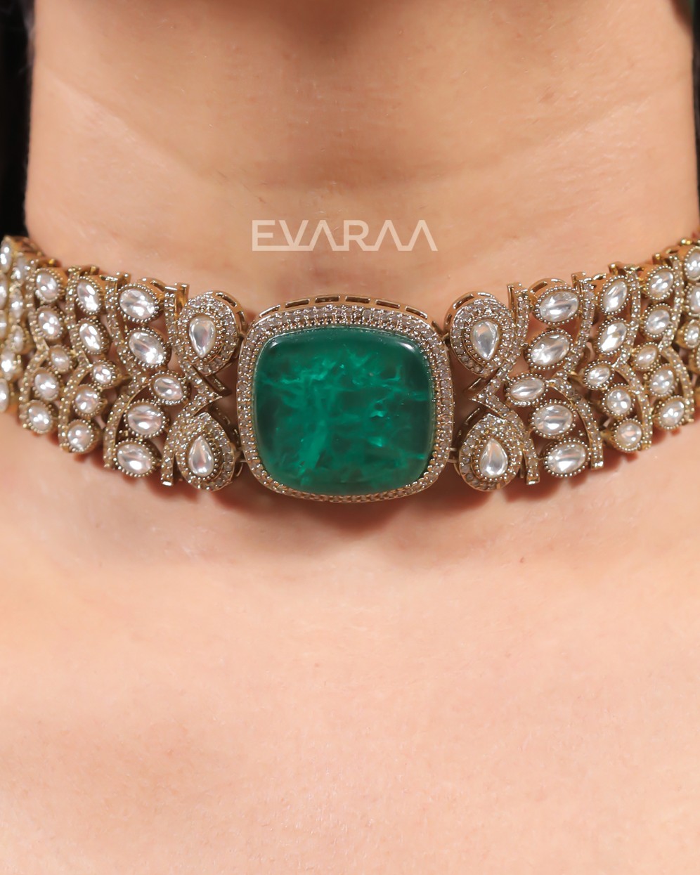 • Anvayi choker features square emerald doublet framed with brilliant cut diamonds.