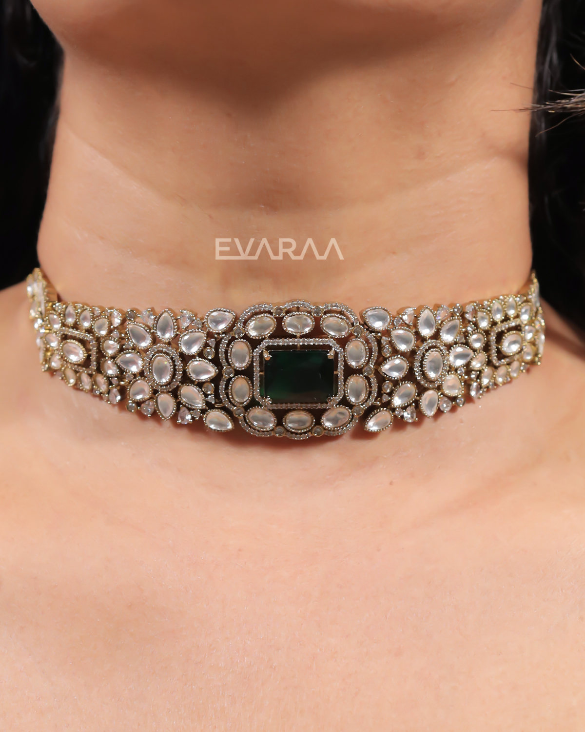 • ​The centerpiece of both the choker and the earrings is a striking dark emerald-green stone, framed by the sparkling white stones.