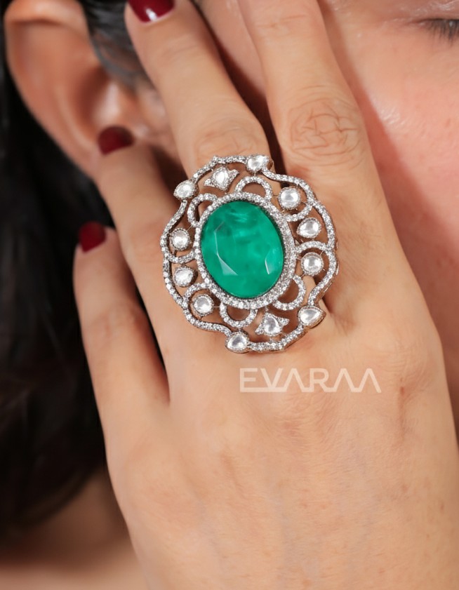 This is an eye-catching cocktail ring featuring a large, oval-cut green gemstone at its center. The central stone is surrounded by an intricate, floral-inspired setting embellished with small, brilliant-cut diamonds and larger, irregular-shaped Polki and uncut diamonds. The design is opulent and traditional with a statement size, suitable for formal occasions.