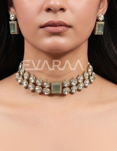 This exquisite choker necklace features a double row of sparkling, uncut stone (likely Polki style) embellishments, creating a dense and luxurious look. The focal point is a square-cut, pale green stone set in the center. It is finished with an antique gold-tone setting, giving it a traditional yet sophisticated appeal. The set is completed by matching square stud earrings that mirror the design and the central green stone of the necklace.