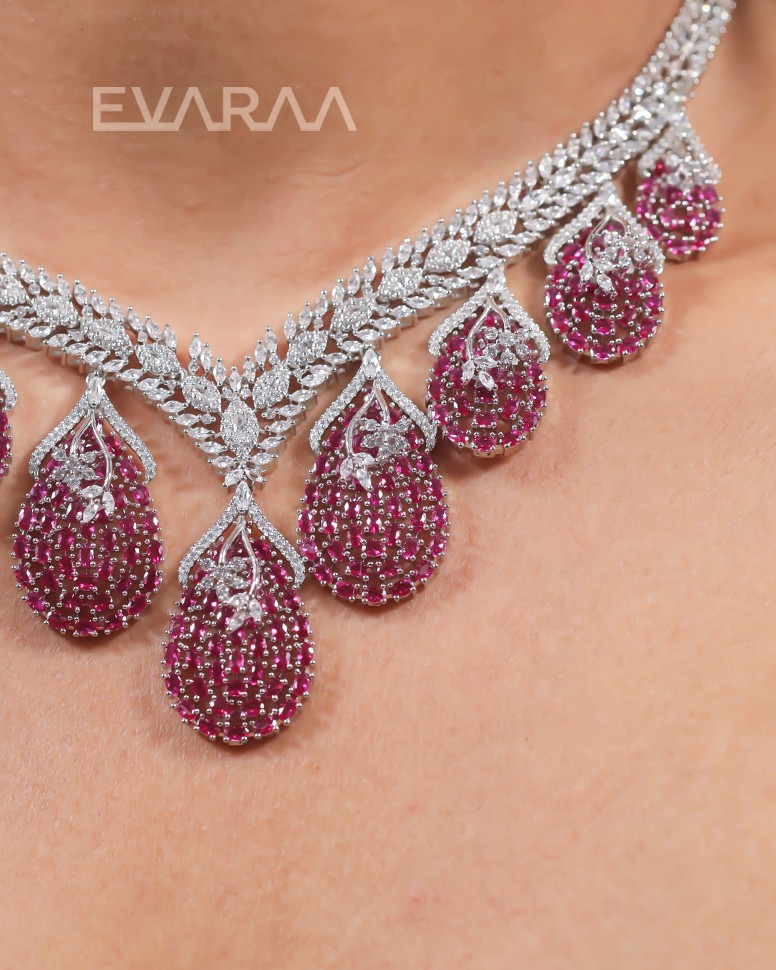 This is a stunning necklace featuring a delicate, leaf-like American diamond setting along the chain, which culminates in multiple teardrop-shaped pendants. Each large pendant is richly adorned with vibrant, pave-set red gemstones, likely rubies, creating a magnificent cascade of color and sparkle. The overall design exudes luxury and intricate craftsmanship.