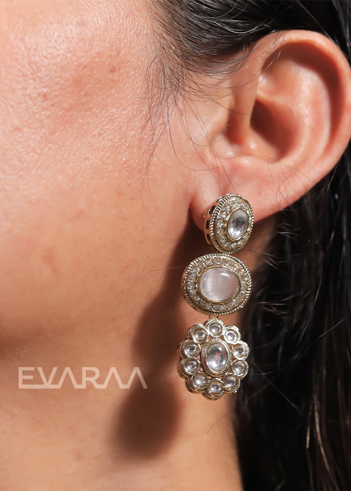 • Design Details: It has two tiers of elements: the upper layer of oval stones and a lower layer of hanging floral clusters set with Polki.