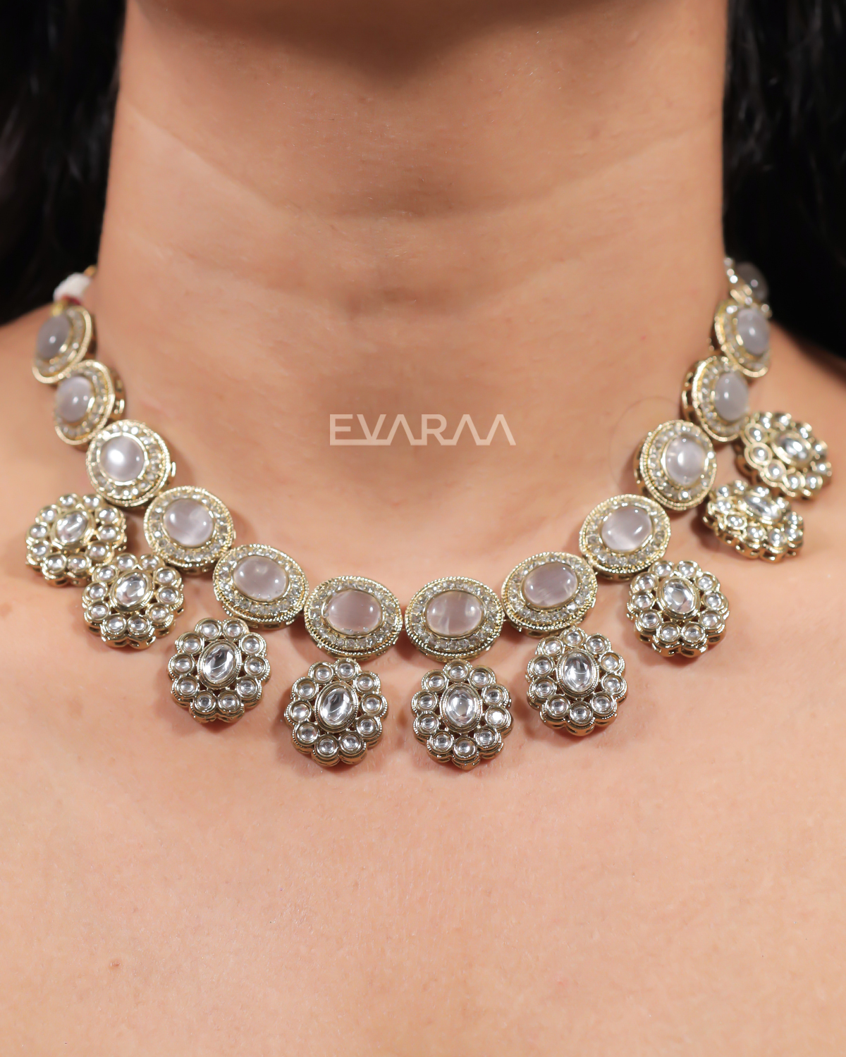 • Overall Look: A heavier, collar-style piece offering an understated elegance with a combination of larger opaque stones and smaller, clear Polki accents.