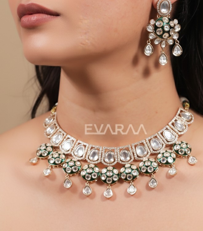 This is an exquisite Kundan-style choker necklace, featuring a combination of clear, polished stones set in a 22 carat gold-toned base. The upper row showcases a delicate line of teardrop and oval-shaped clear stones. The striking lower section features a row of circular motifs set in deep emerald green enamel (meenakari work), each centered with a clear stone, from which teardrop-shaped clear stones are suspended as drops. The design blends traditional Indian craftsmanship with a rich, regal aesthetic.