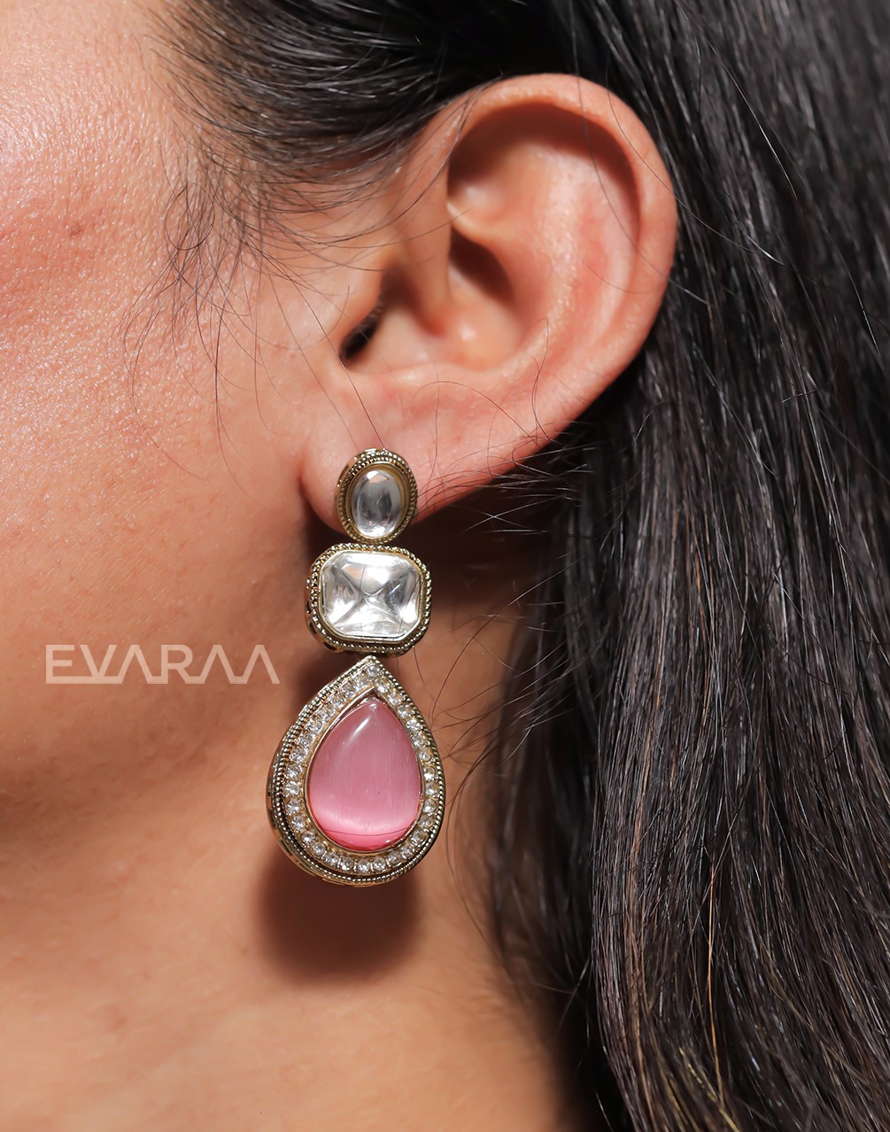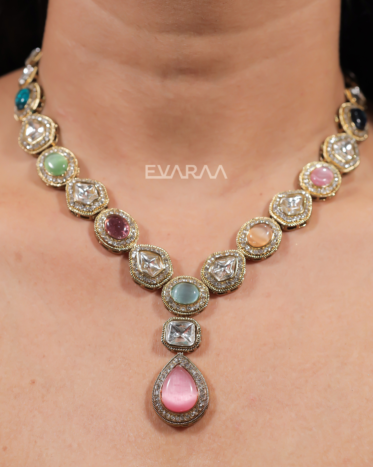 This necklace features a beautiful V shaped design, characterized by an array of polki-style interspersed with colorful cabochon gemstones. The stones are set in what appears to be a 22 carat gold-plated, giving it a rich, traditional, and regal aesthetic. A prominent, elongated pink teardrop gemstone forms the elegant central pendant drop.